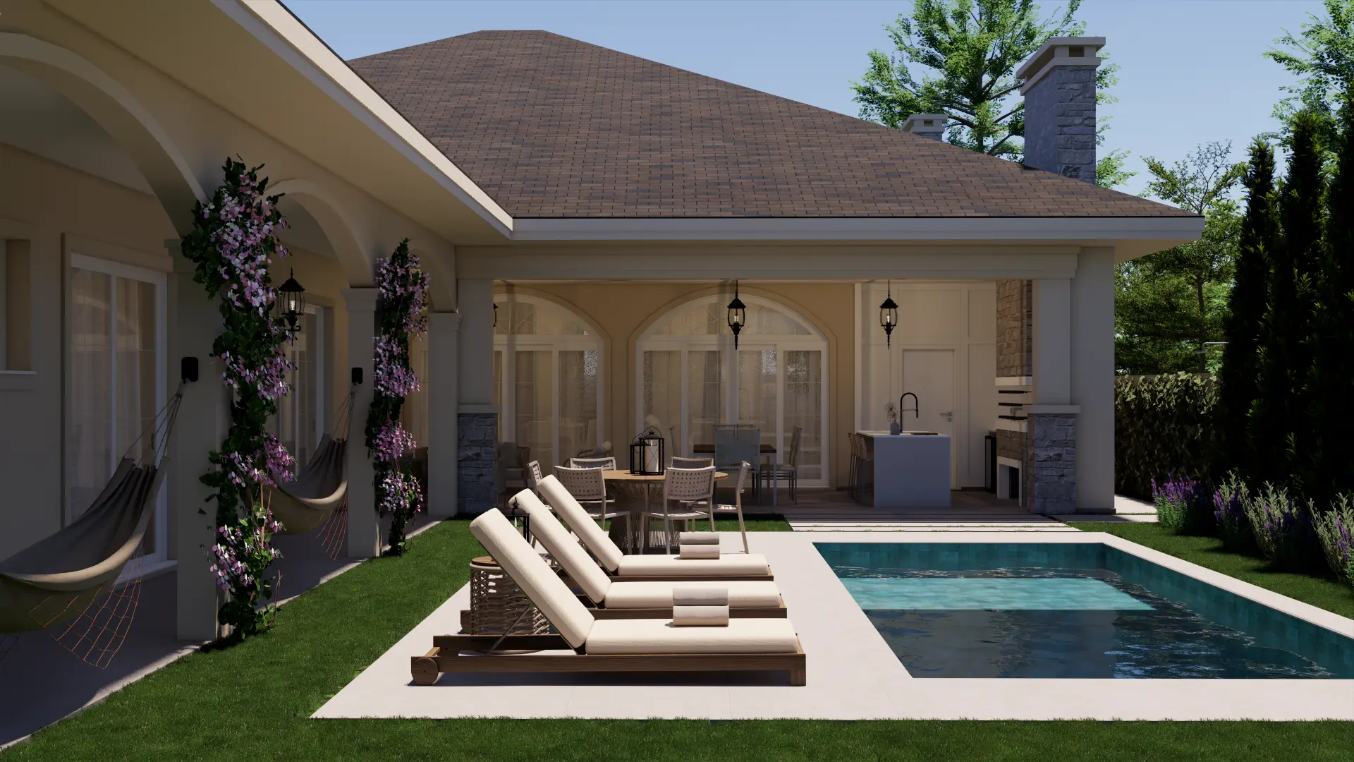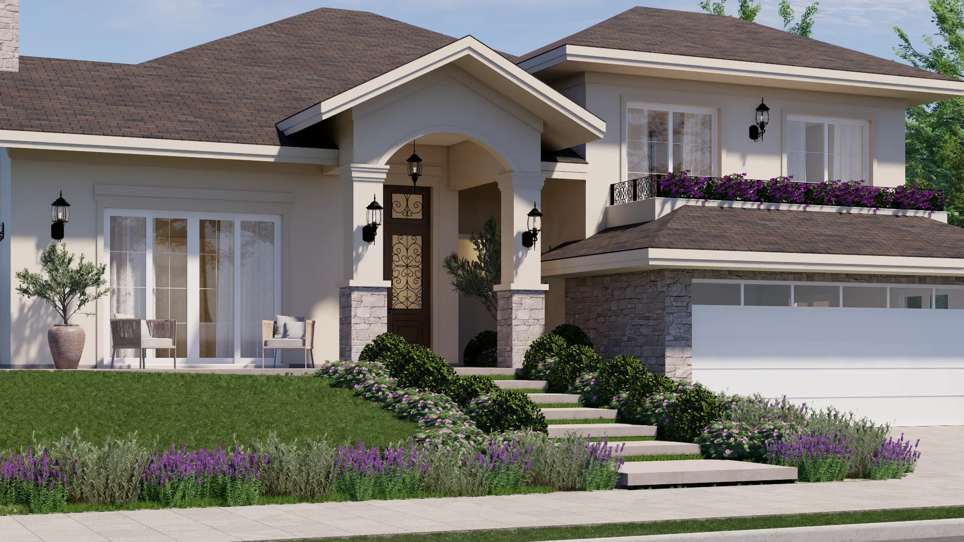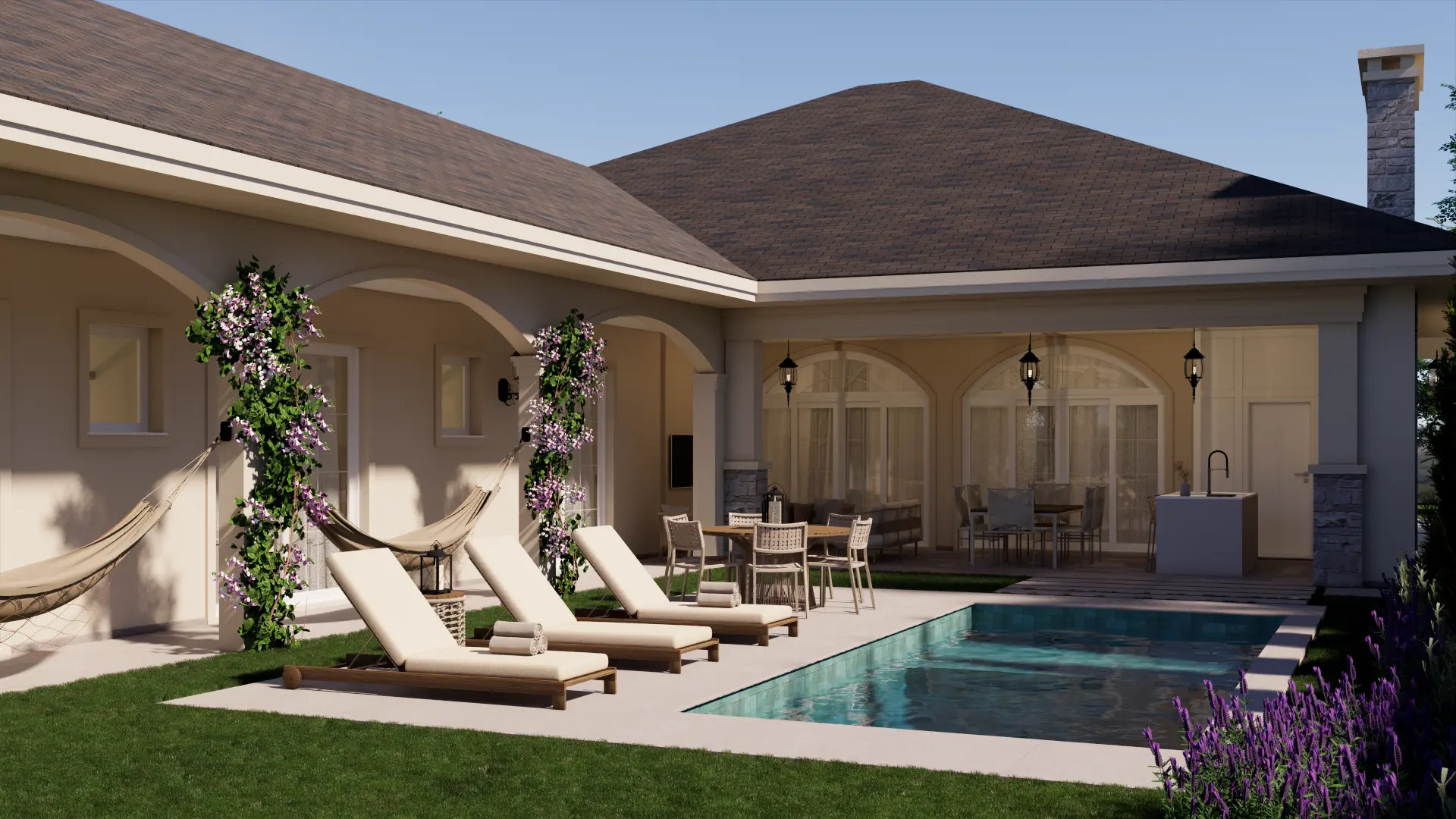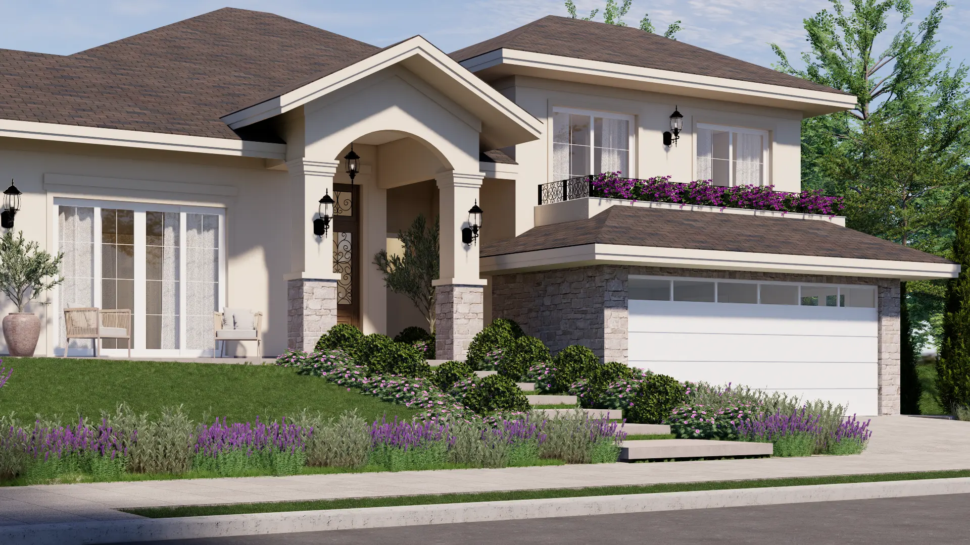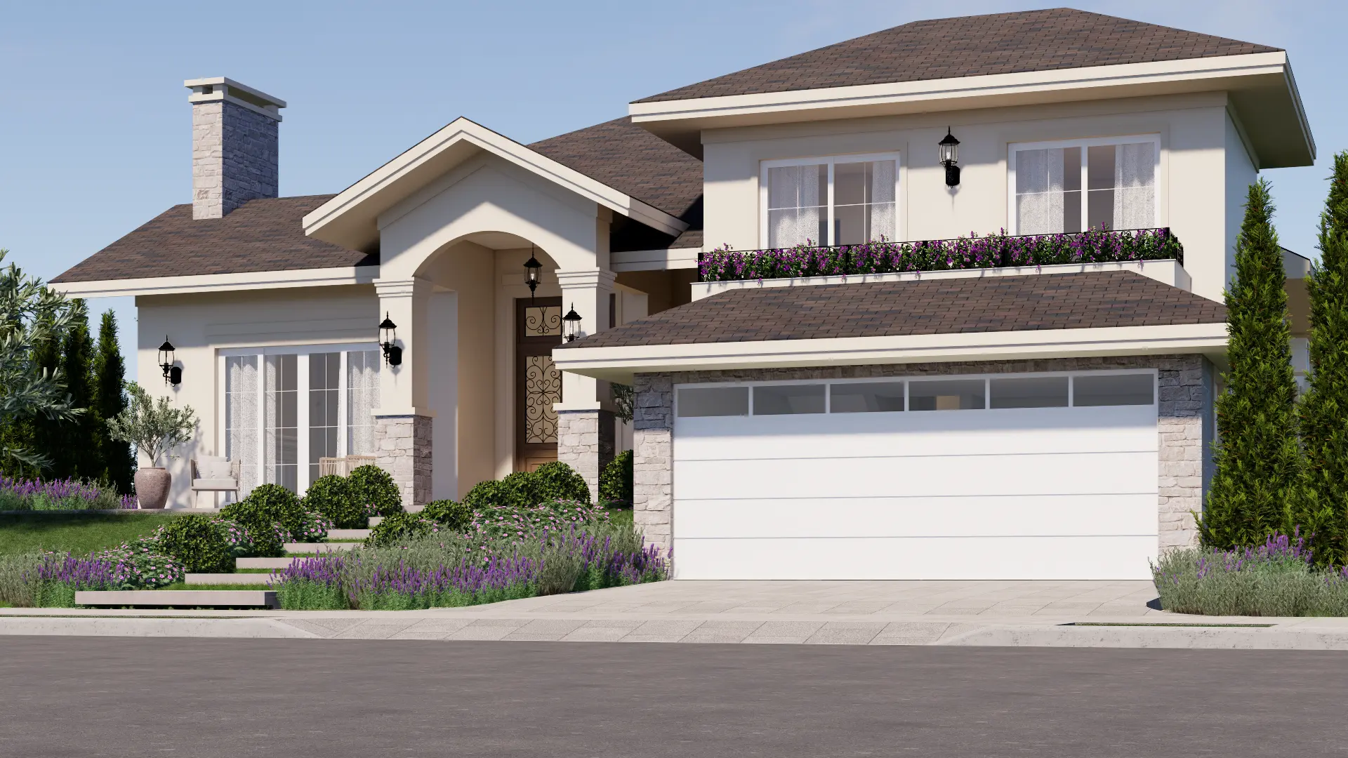A Casa Madrid é um projeto de casa de alto padrão com mais de 500 m² que combina o estilo americano com traços da arquitetura espanhola, reinterpretados pela assinatura autoral da Legonde. O alpendre com arco marcante, os telhados aparentes e os materiais atemporais criam uma fachada elegante, acolhedora e cheia de personalidade.
