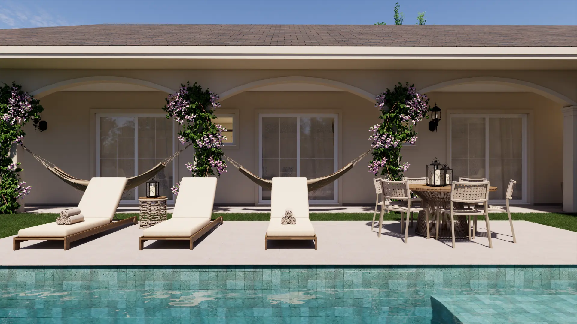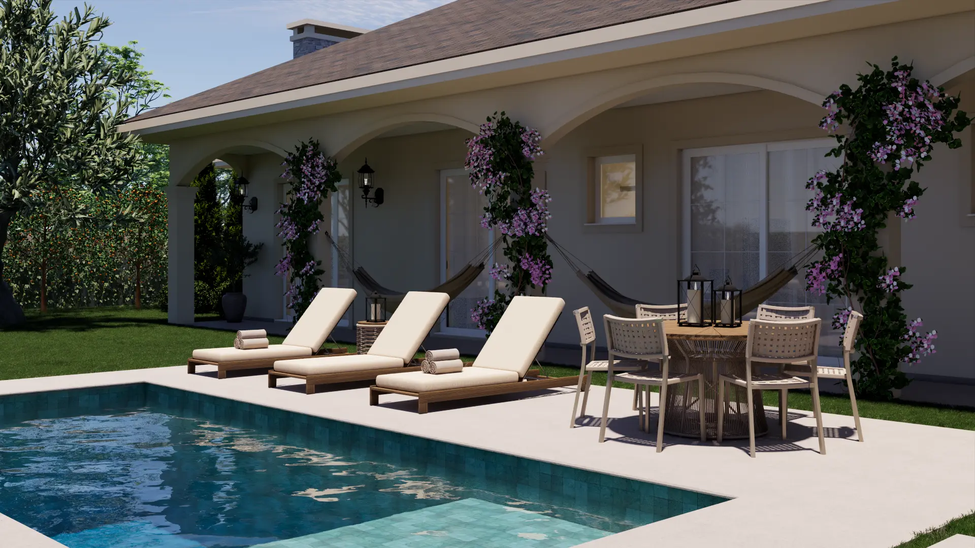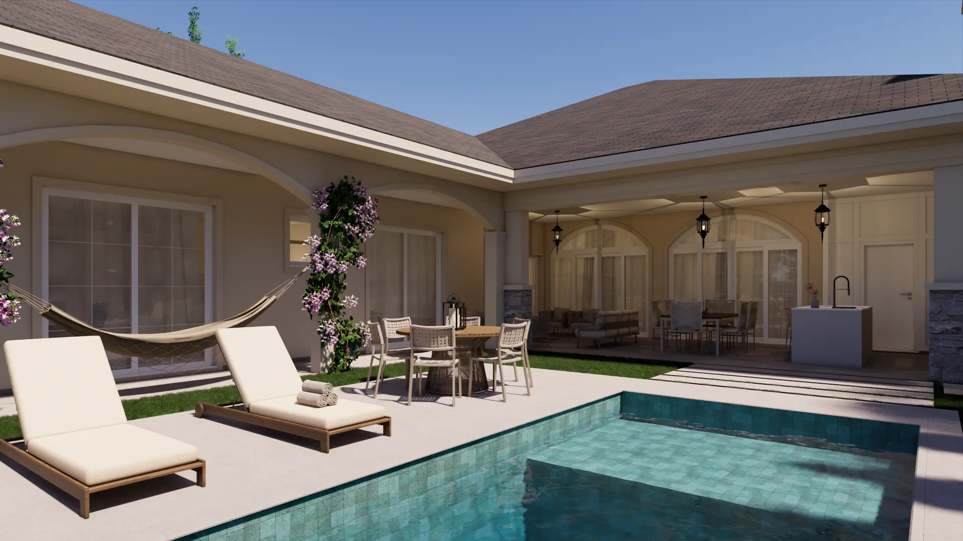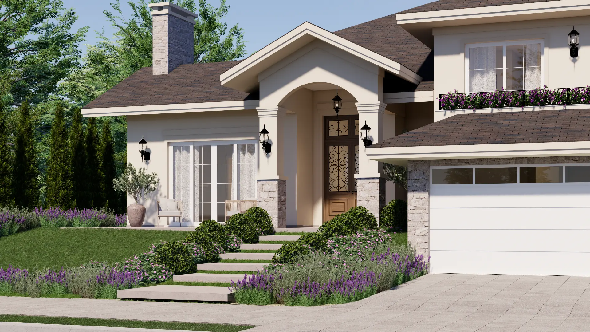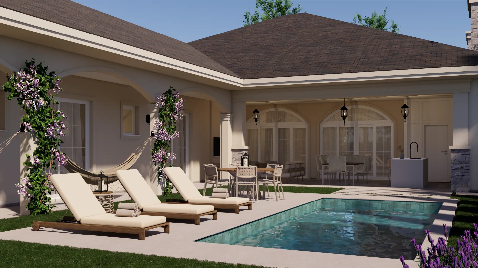 A Casa Madrid é um projeto de casa de alto padrão com mais de 500 m² que combina o estilo americano com traços da arquitetura espanhola, reinterpretados pela assinatura autoral da Legonde. O alpendre com arco marcante, os telhados aparentes e os materiais atemporais criam uma fachada elegante, acolhedora e cheia de personalidade.